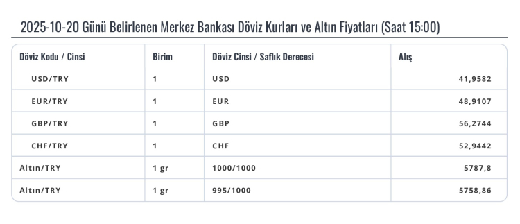 20 Ekim 2025 tarihli TCMB Döviz ve Altın Fiyatları